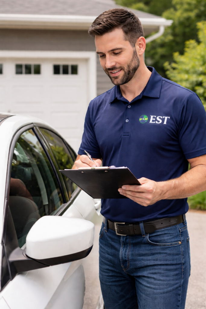 Nope. We come to your location — your home, office, or wherever works best. We handle everything on-site including the inspection and paperwork.